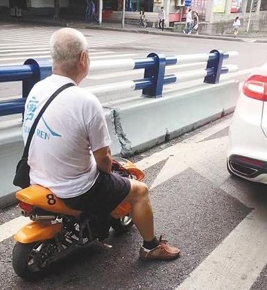 7月17日早上,市民黄女士上班时在江北观鸿大道附近看见一位年龄70岁左右的大爷,穿着白色T恤搭配运动短裤,满头银发骑着一辆迷你电动儿童车,停在一个红绿灯路口前,画面相当童真。黄女士说,看着老人这样骑,还是有点惊心,还是希望提高安全意识。