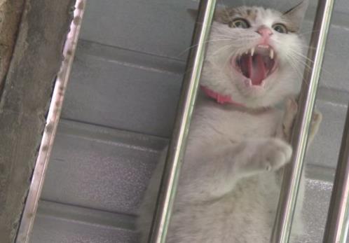 猫咪太肥被卡防盗网 见人就凶女子吓得够呛