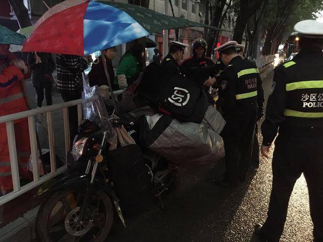 沙区民警巡逻至站东路时,发现了趴在地面上的李某,身上压着装满货物的摩托车,前方不远处停着一辆打着应急灯的越野车,过往的车辆也堵起来了。
