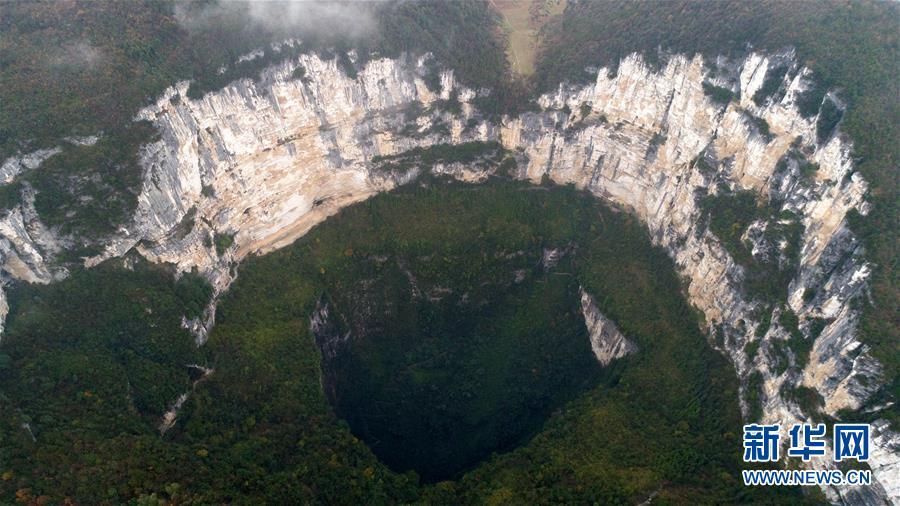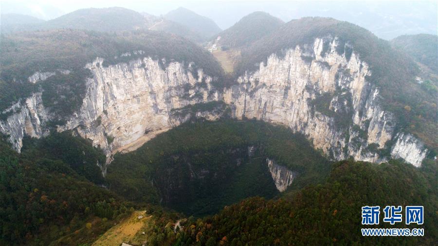 这是11月28日航拍的重庆奉节小寨天坑。小寨天坑位于重庆市奉节县兴隆镇小寨村,坑深666米,是闻名中外的世界地质奇观。 (来源:新华网)