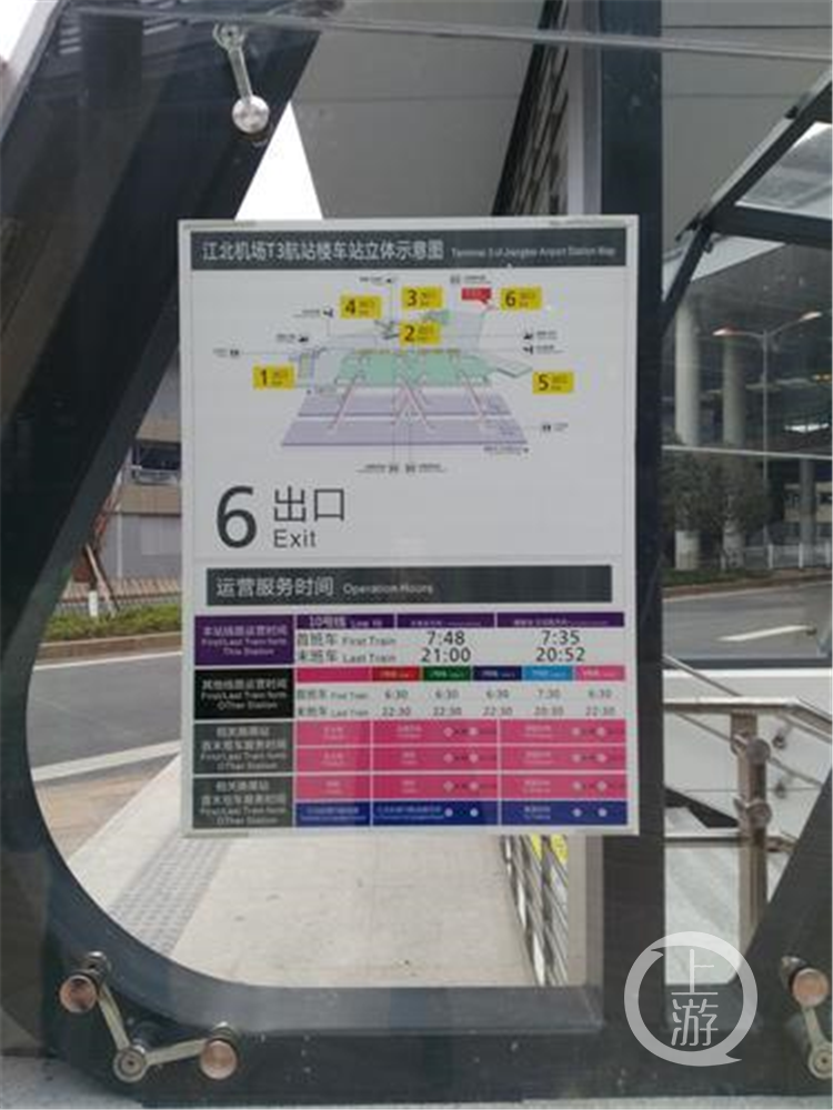 记者在轨道交通10号线江北机场T3航站楼站运营服务时间表上看到,车站往鲤鱼池方向首班车时间为7:35,末班车时间为20:52;往王家庄方向,首班车时间为:7:48,末班车时间为21:00。