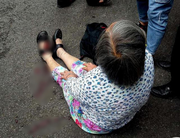 通过现场图片可以看到,老太坐在地上,脚背被挂出一个口,鲜血直流,地上也遍布着血迹,老太的背包也被挂烂。