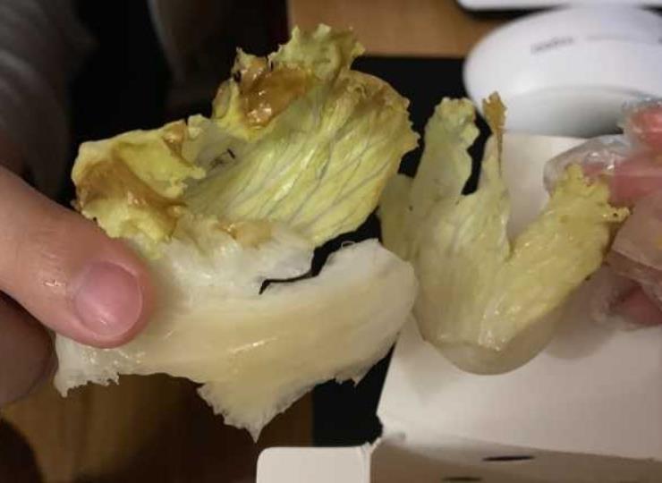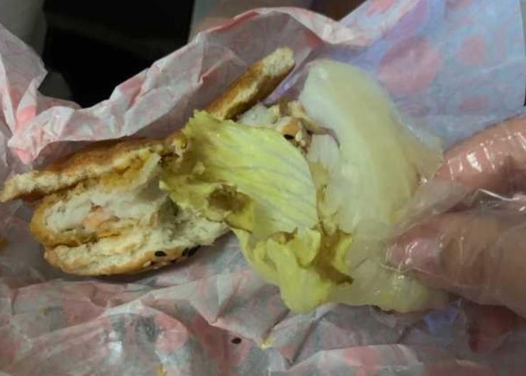 食客点外卖要了个汉堡 里面夹的生菜竟是烂的