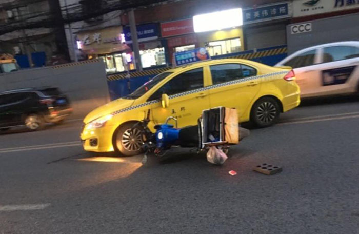 外卖小哥的摩托被出租车撞倒 箱子里的餐点掉了出来
