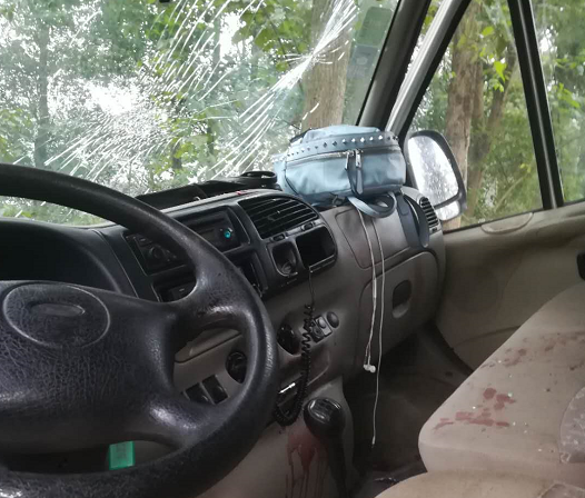 救护车驾驶室的挡风玻璃已经被撞裂,副驾驶的座位上有散落的玻璃渣及血迹,副驾驶座位前方,还遗留了一个女式蓝色背包,从背包中掉落出一副耳机垂挂着。