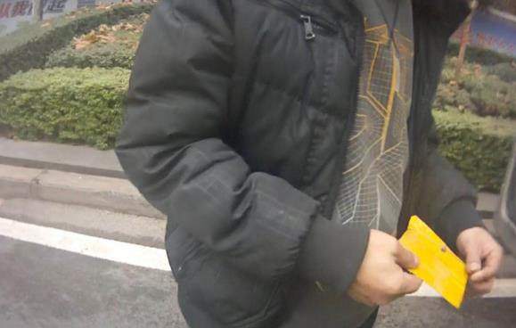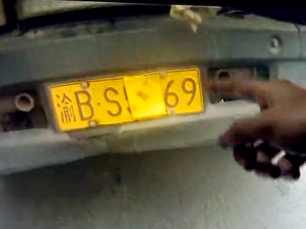 在交巡警的追问下,驾驶员演示了他们的操作方法,原来这块黄色铁皮上有一根铁丝、一串磁铁,可以非常快捷的贴上车牌,为了遮挡号牌真是简易、灵活。