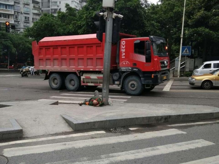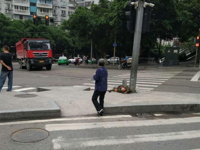 发布时间:2018-05-27 15:25:522018年5月26日,重庆涪陵有市民在大塘路口红绿灯处,看见一名男子躺在电杆旁。