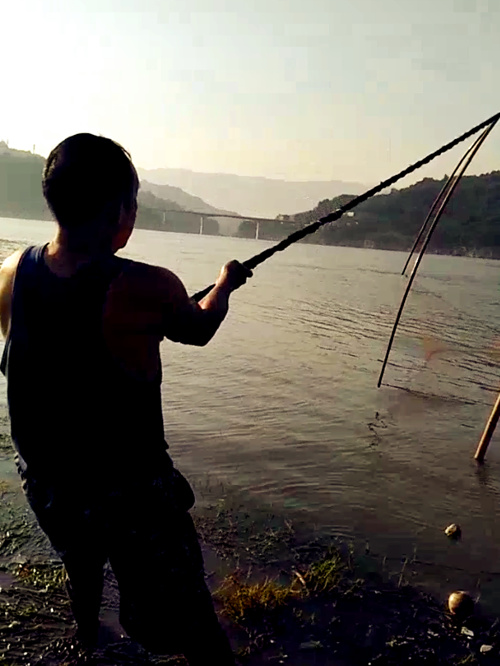 男子长江边“守株待兔”式捕鱼 你见过吗?