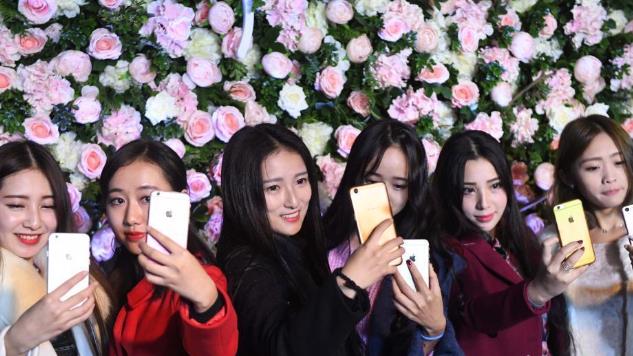 12月11日晚,重庆近百位网红美女聚集在大坪时代天街一酒吧内举行“网红狂欢趴”。图为网红美女聚集一起玩自拍。