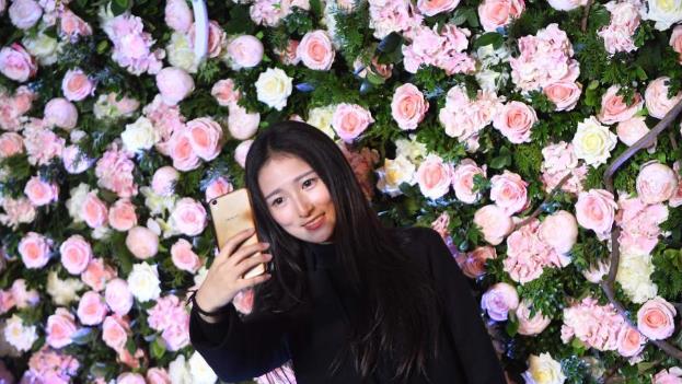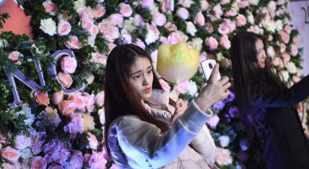 网红们在花前自拍。