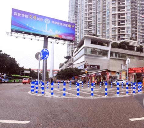 1、将原九码头区域为T形交叉口处改为环道形式,并于环道内侧设置警示柱,防止社会车辆于环道内部停车。于环道周围设置人行横道,其中长滨路掉头处人行横道中部以警示柱与车道相隔离,以保障行人通行安全,同时防止掉头车辆于人行横道处掉头。