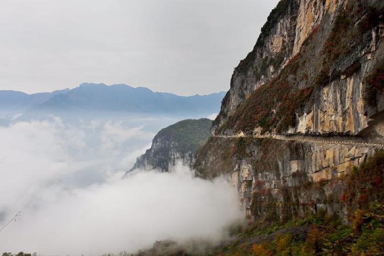 在重庆市开州区满月乡双坪村有一条特殊的农村公路——盘旋于海拔1500多米的高山,上方是岩石,外侧是绝壁深渊,云雾缭绕,险象环生,被称为“悬崖天路”。