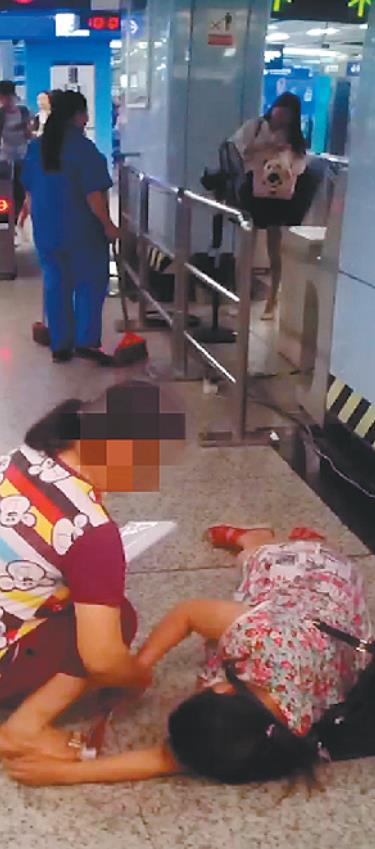 由于这名女士躺在出站必经之地,而且邻近安检机和自动售票机,人流密集,为了避免发生踩踏等情况,工作人员一直在引导围观乘客,随行的大妈则蹲在地上劝说假装晕倒的女士。