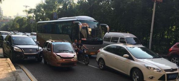 昨天一大早,大渡口区西城大道羊子岩隧道内交通严重堵塞,除了因为车流量较大以外,洞口处一辆SUV和一辆三轮摩托车因为发生了擦挂,双方为责任争执不下拒不撤场,导致匝道进入隧道的单向道路被堵塞,后面的车辆不得不变道绕行。如此一来因为一个小事故受到影响的车道就占了2个,仅剩下最左边1个通道可以正常通行。