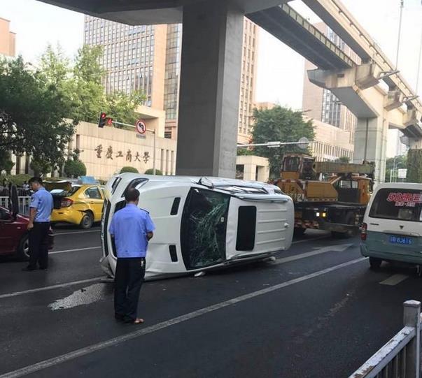 8月15日晚高峰期间,南岸区五公里轻轨站下一辆白色奔驰车因事故原因侧翻,导致该路段异常拥堵。