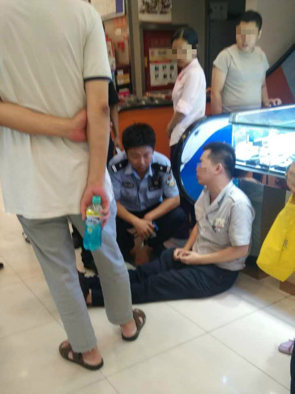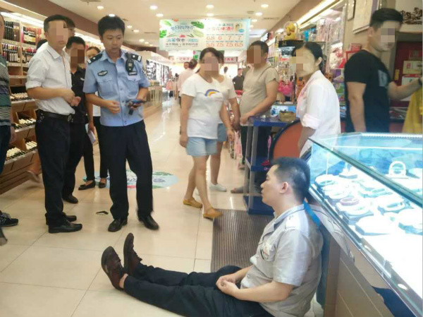 8月17日早上,重庆渝北加州一超市的市民来来往往,而超市的一名保安却倒在地上紧紧地抓住一名男子的裤脚。