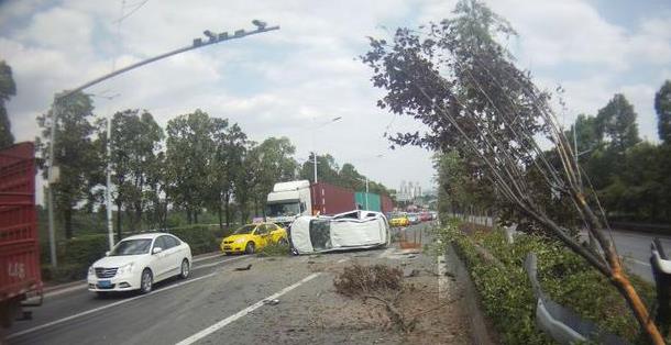 近日,北碚区蔡家中环快速干道发生一起单车事故,一辆小车由于急于抢黄灯操作不当,跨过道路绿化隔离带,撞断2棵树,侧翻在对面车道。所幸的是驾驶员只是受了点轻伤。