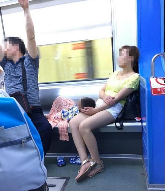 女子带小孩坐轻轨躺卧座椅 周围乘客站着