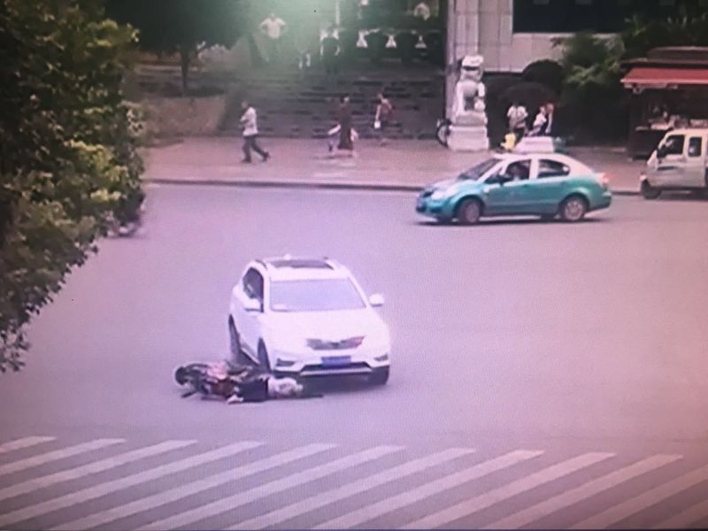 9月5日下午六点半左右,在南川金山大道泰园路口,一辆直行的小车突然左转,其右侧直接撞上了直行的电动车,车轮与被撞者头部“亲密”擦过。