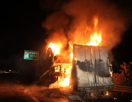 4时04分,消防官兵赶到事故现场。当时,起火挂车的集装箱正在猛烈燃烧,冒出滚滚浓烟,附近路面散落着燃烧飞溅出的碎渣,高速公路执法人员已经对现场进行了交通管制。
