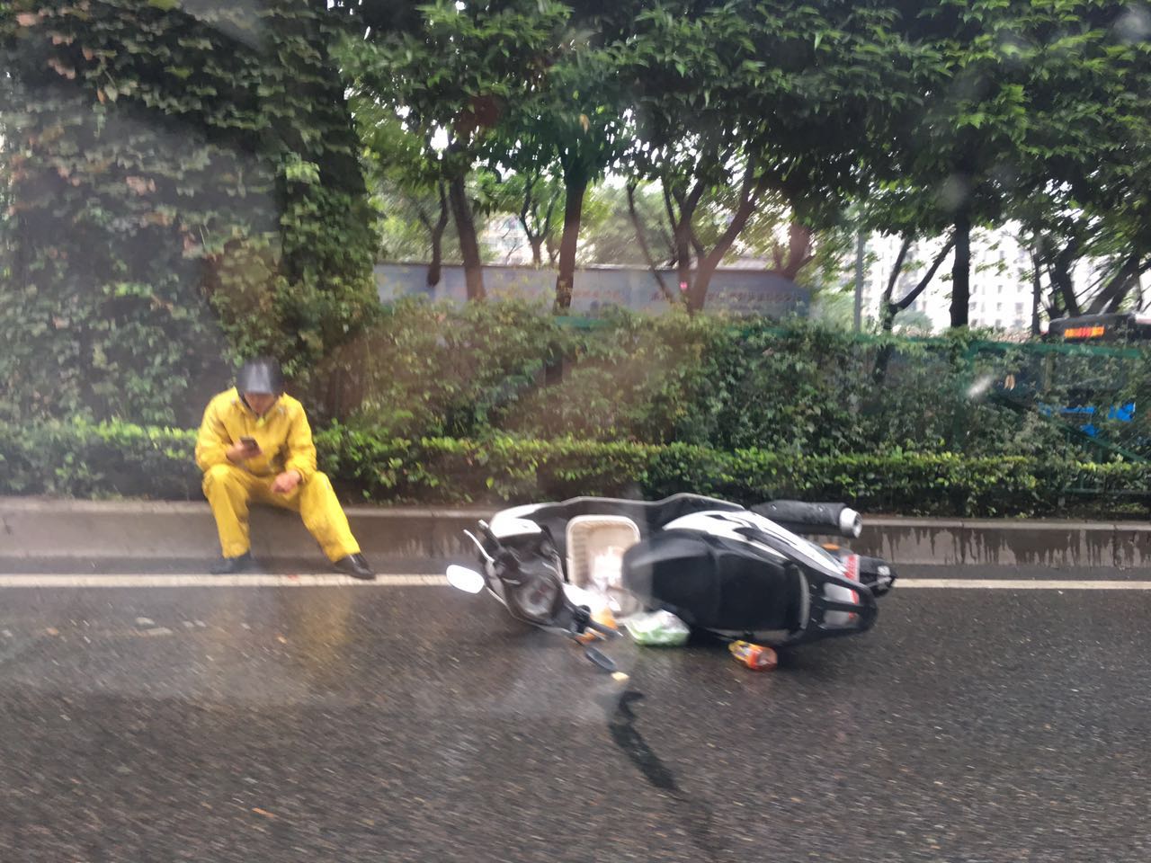 外卖小哥雨中滑倒餐盒倾洒一地 路人:请别责怪