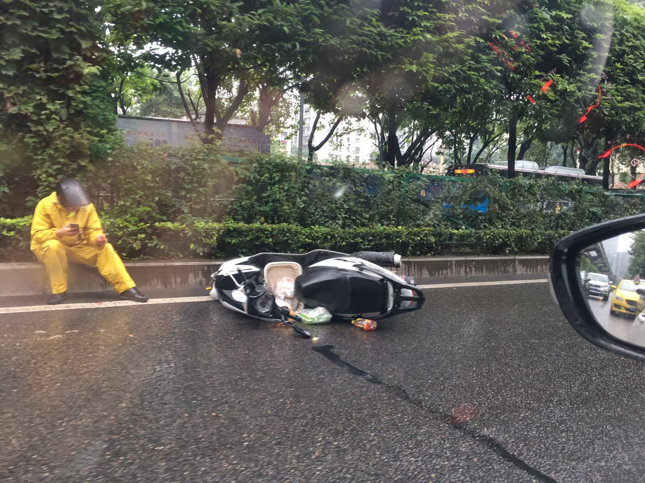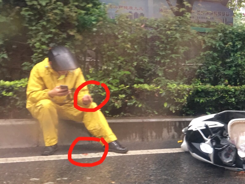 摩托车旁,一位身穿黄色工作服的小哥正坐在地上打电话。一辆辆车从小哥身旁驶过。小哥带着帽子,虽然看不清他的脸,隔着车窗玻璃,袁小姐也感受到了小哥内心的崩溃和无助。