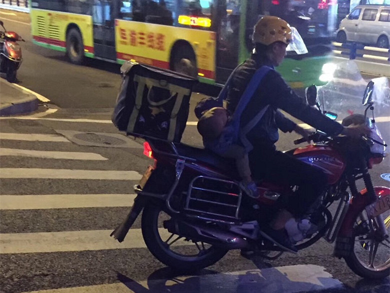 外卖小哥背着熟睡小孩送外卖 路人:十分揪心