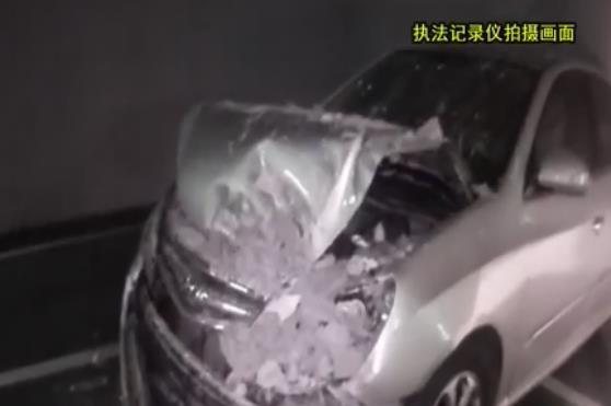 通过执法记录仪拍摄的画面我们可以看到,该轿车受损严重,前车灯已经掉落,整个引擎盖也完全损坏,地上到处是车辆的碎片和一些碎石块。