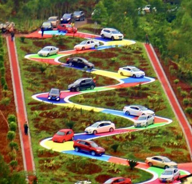景区工作人员介绍,这条S形彩虹公路是景区对市民免费开放的体验性路段,全线铺装了高强度防滑的彩色沥青路面,远远望去宛如鸡公山上一道七彩斑斓的彩虹。