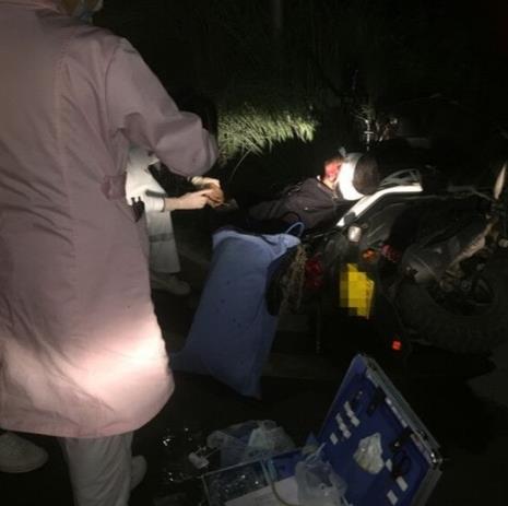 摩托车驾驶员姓王,民警赶到时他已经浑身是血,倒在路边呈昏迷状态。小轿车副驾驶室位置的女乘客也在呻吟,其胸部被顶撞,右手臂淤青肿胀。很快,120救护车赶到,民警配合医护人员将伤者送去医院抢救,然后开展事故调查。