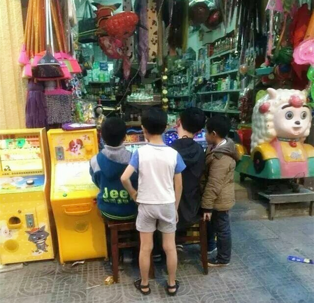 从他们的模样不难看出,都是小学生。游戏机旁边的三个小学生,个个棉衣棉裤保暖鞋加身,在游戏机旁玩的不亦乐乎。