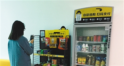 记者注意到,便利架和饮料柜上显示着“自助选购,扫码支付”几个大字,大字下面则贴有购物流程。饮料柜柜门旁还写有“请诚信购物,先支付后取货”。