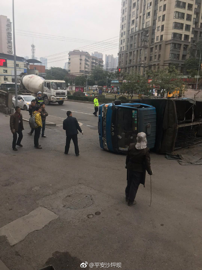 来自平安沙坪坝官微的消息:近日,110快处队民警在巡逻至凤中路西物市场一红绿灯附近时,发现一辆小货车发生侧翻,幸好车上只有一人轻微受伤。