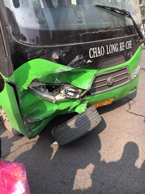 客车车头严重受损,车灯处被撞坏。