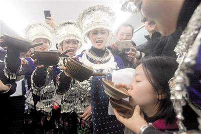 与此同时,数名穿着贵州特色少数民族服饰的动妹、苗妹、苗哥组成迎客队,身着苗族服装的表演人员以吹奏芦笙开场,庆祝渝贵铁路开行。5名重庆动妹和民警与5名贵州苗妹苗哥拉着红绸登场,随双方的对歌红绸越拉越近,寓意高铁速度拉近渝贵距离。节目最后,迎客队用“高山流水”的形式,用米酒欢迎乘客。