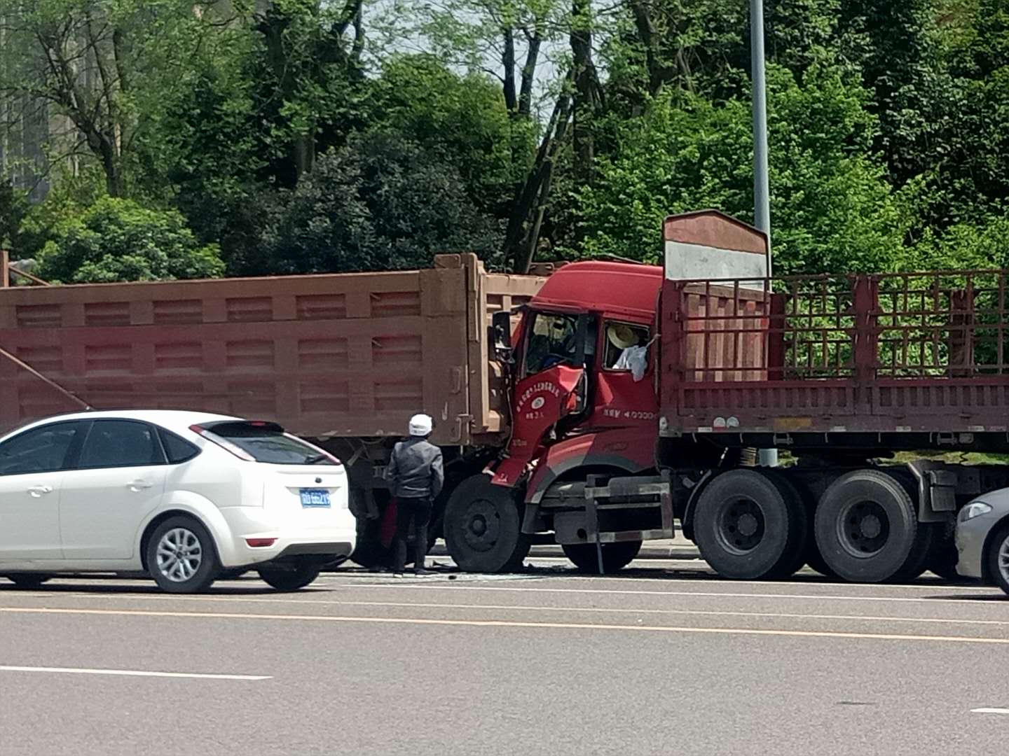 在路过璧山黛山大道金科中央城附近时,两辆货车又追尾了。