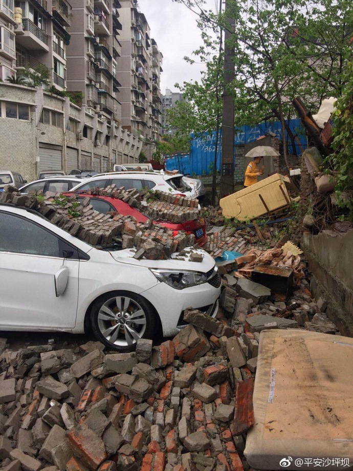 来自平安沙坪坝官微的消息:4月5日9时许,沙坪坝华岩一村一处围墙被大雨冲垮,停在旁边的三辆汽车被倒下的围墙砸中受伤不轻。