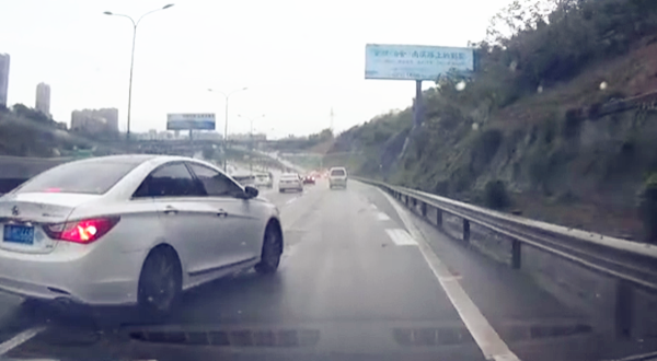 白色轿车进入最右侧车道后如果踩油门走了还没事,可它居然一个急刹停了下来。这一举动将后方的爆料网友吓得不轻,“差一点就撞上了”。