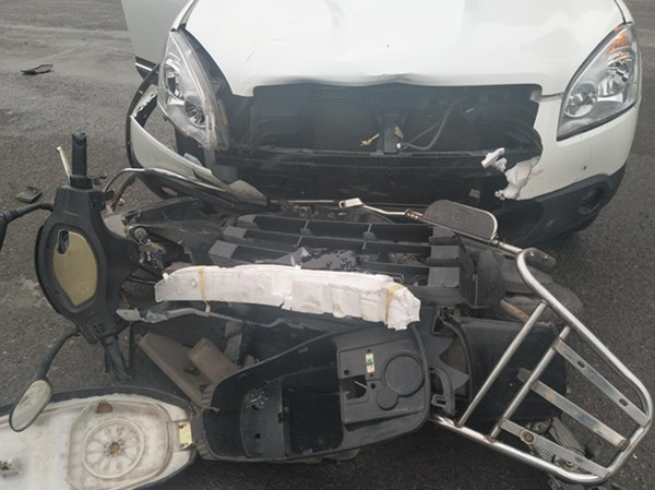 十字路口两车相撞 摩托车零件脱落