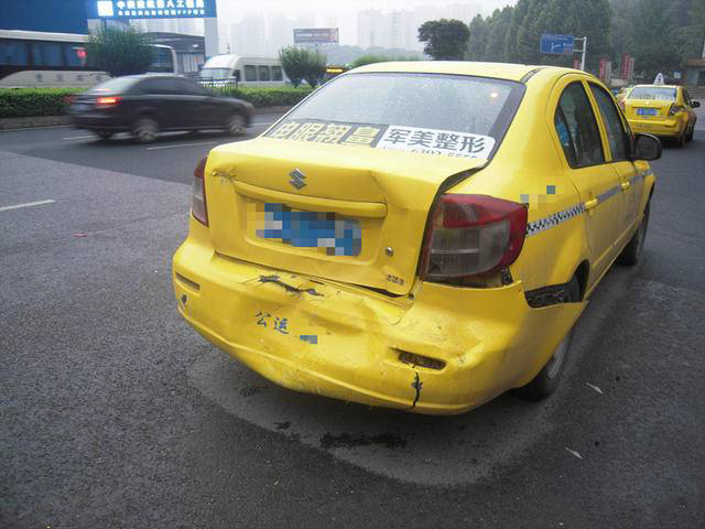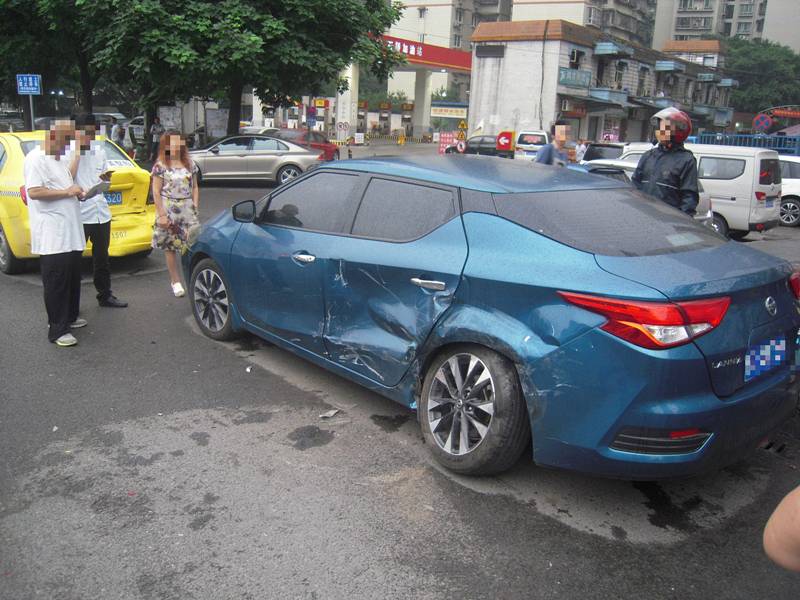 民警在现场发现,3辆车被撞得相当严重,蓝色轿车左侧两扇车门已经变形,后轴也被撞断,出租车和另一辆小轿车也不同程度受损。