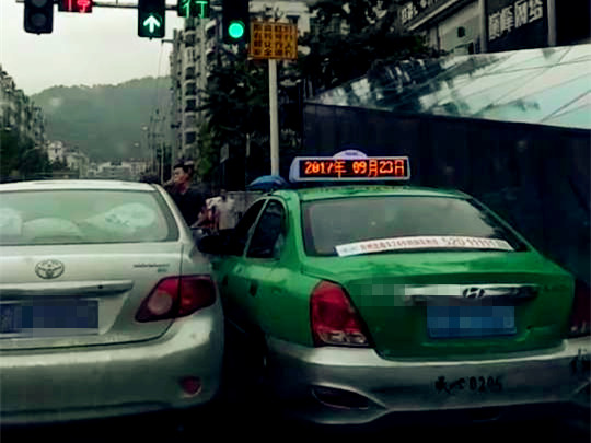 出租车司机和私家车司机双方对骂起来,言辞异常火爆,引来不少围观路人。俩司机一边打,一边骂,也有人出来劝架,但似乎没有什么作用。