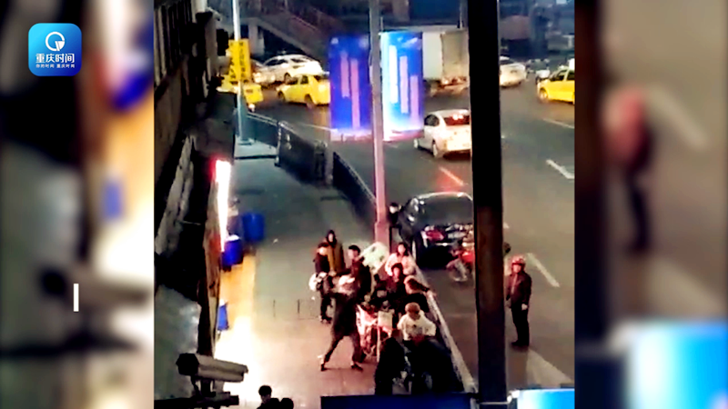 路边是长长的护栏,护栏一侧车来车往,有不少出租车、私家车按起了喇叭。因为期间,塑料凳残骸、碎酒瓶玻璃飞溅到了道路上。
