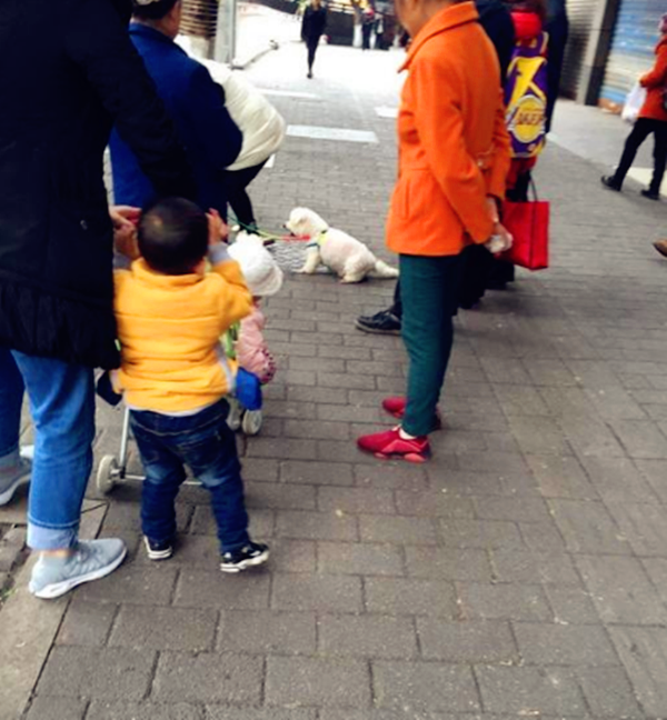 不一会儿,比熊犬周围就聚集了一大堆围观者,大家议论纷纷。