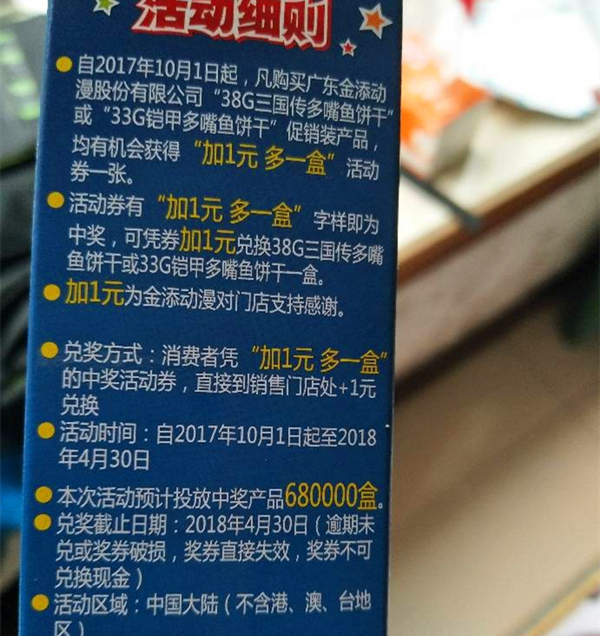 当天中午,李女士的小孩在楼下的超市购买了一盒零食,孩子打开包装后,发现中奖了,“上面写着加1元可以兑换一盒”。