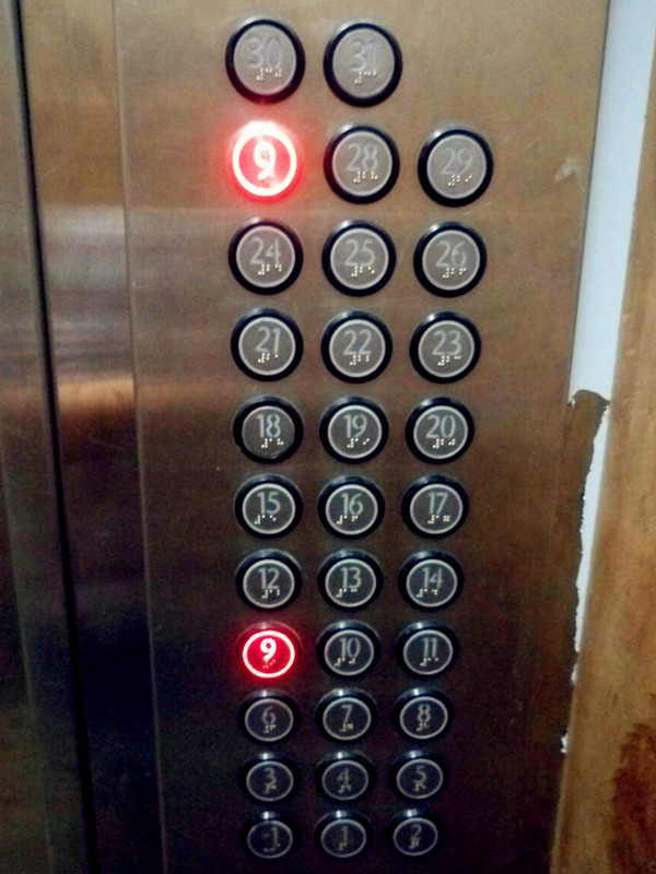爆料网友说:“大约一个月前,自己去迎宾一号小区拜访朋友,当时我正要去9楼,一进电梯就下意识的直接按了最上面一个9号,结果一起进电梯的另外一个人在16楼都下了,我才恍然发现我要到的9楼居然还没停!再仔细一看这台电梯里居然出现了两个9楼编号,最上面一个9楼编号原来本是27楼编号,估计掉了后不知谁给安了一个9号上去,太坑人了”这让网友只好选择中途出电梯,再乘电梯下到9楼。
