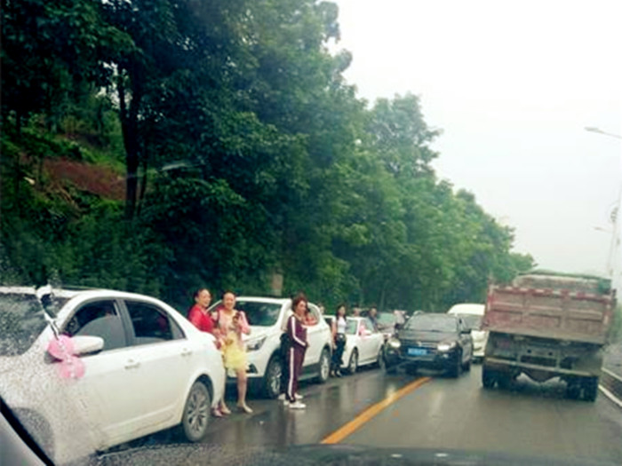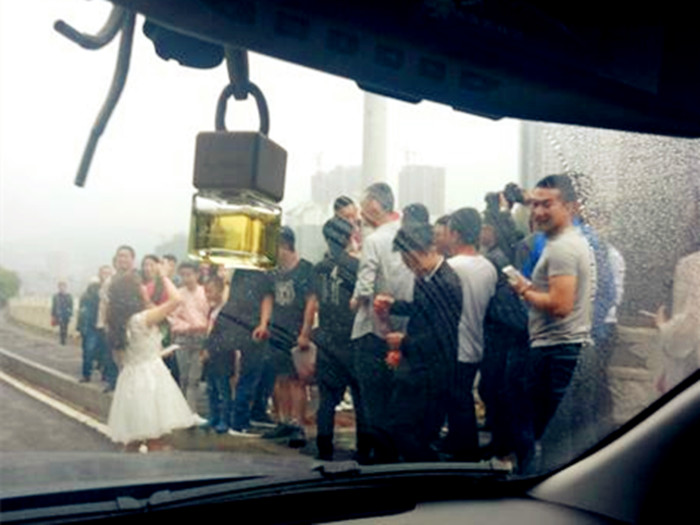 而“婚闹”现场对面,则停下了一长排婚车,车内下来不少人,也举着手机在抓拍。令不让私家车不得不贴着缝隙行驶,把原本两车道硬生生挤成三车道,令许多私家车主十分不解,认为这样做实在太危险了。