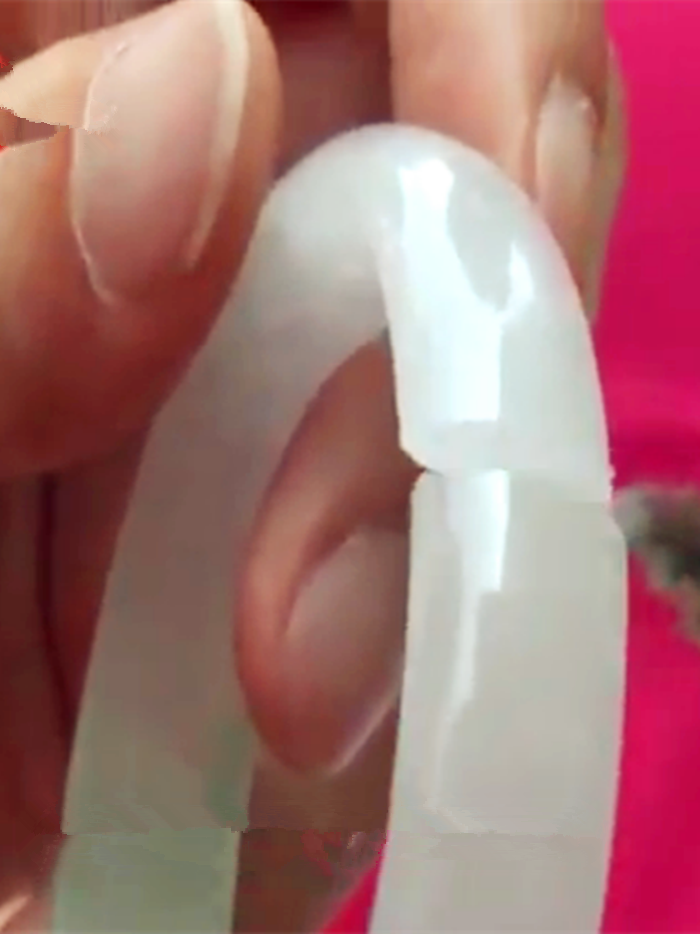 断裂后的玉镯可见两条明显的裂痕,玉镯已经一分为二,裂口可见凹凸不平的玉痕。
