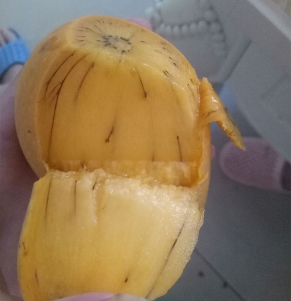 随后用水果刀从表皮切两刀,用手扒开一看,发现里面全是黑丝,而且黑丝陷在果肉上,还不断地在扩散。