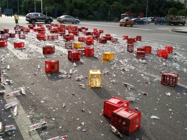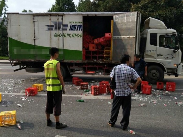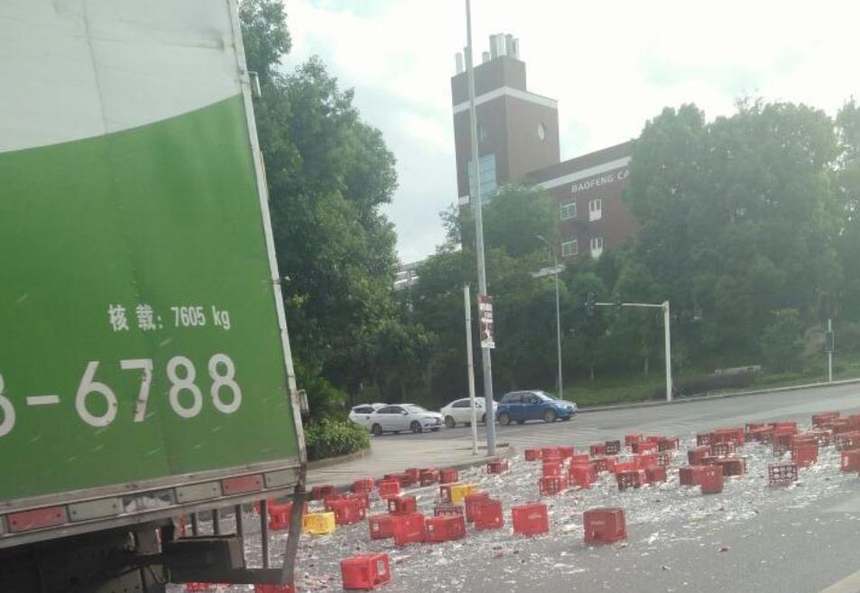 啤酒箱从货车里掉落 玻璃碎片洒落一地