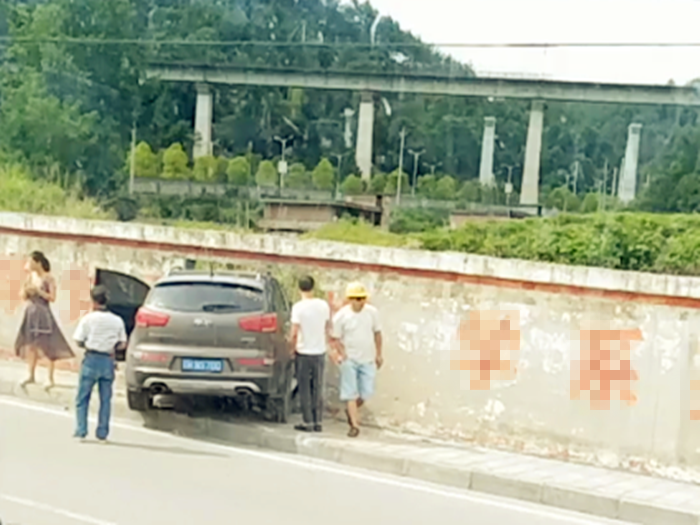 2018年6月29下午,重庆黔江正阳工业园区附近,一辆轿车冲上路边人行道撞穿砖墙,尴尬的停了下来。
